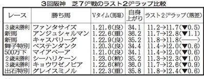 ラストの切れ味に焦点を絞って白羽の矢を立てたのがキャスパリーグ。阪神7ハロンの新馬勝ちの自身上がり3ハロンは35秒2(別表参照)。Vタイムも重馬場での一戦に劣るようではあまりに平凡? それでも狙ってみたくなる根拠はラスト2ハロンの11秒8→11秒8にある。
